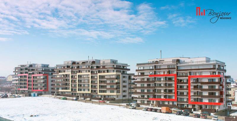 Cartierul Bonjour Residence se intinde pana in zona Andrei Muresanu, si ofera o panorama superba asupra Clujului. Amplasat la doar 1 minut de Calea Turzii, principala artera de intrare in Cluj-Napoca, pe care sunt amplasate: 90% din showroom-urile auto din Cluj, 3 cladiri de birouri, cel mai mare spital privat din Cluj. Ansamblul Bonjour Residence este prevazut cu 7 imobile cuprinse intre P+2E si P+8E+R, in total peste 600 de apartamente noi. In momentul de fata sunt finalizate si inscrise in cartea funciara apartamentele din 6 imobile. 98% din apartamentele finalizate din cartierul Bonjour Residence au incheiate contracte finale de vanzare- cumparare si sunt locuite. Constructia pentru ultimul imobil de apartamente a fost demarata in august 2015 si are termen de finalizare iunie 2016, si sunt contractate 70% din apartamente. Ansamblul prevede apartamente cu 1, 2, 3 si 4 camere sau apartamente tip penthouse, spatioase, cu vedere panoramica asupra orasului, amenajate dupa gustul si la cererea clientilor, numai cu materiale de buna calitate. Apartamentele sunt predate finisate sau semifinisate, in functie de preferintele clientilor. Materialele si tehnologiile folosite la constructia imobilelor sunt din game superioare. Designul si finisajele interioare si exterioare au fost recomandate si alese de catre echipa de arhitecti care a proiectat intregul ansamblu Bonjour Residence, astfel incat sa fie placut, modern, confortabil si de calitate. Blocurile au parcare subterana la subsol si sunt dotate cu lifturi hidraulice, silentioase si rapide, care asigura accesul la apartamente direct din locul de parcare subterana. Centrul de cartier Bonjour Residence este prevazut cu o cladire de birouri clasa A, 2S + P + 9E, in suprafata totala de 17.000 mp. Cladirea va beneficia de 2 niveluri de parcare subterana, iar la parter va dispune spatii comerciale vitrate, cu un front de cca 100 m la strada Buna Ziua. Armonie si siguranta - copiii beneficiaza de spatiu adecvat pentru o buna educatie foarte aproape de casa. Ansamblul Bonjour Residence are in proiect dezvoltarea unei zone de invatamant pe o suprafata de peste 2500 mp, indica site-ul dezvoltatorului.
