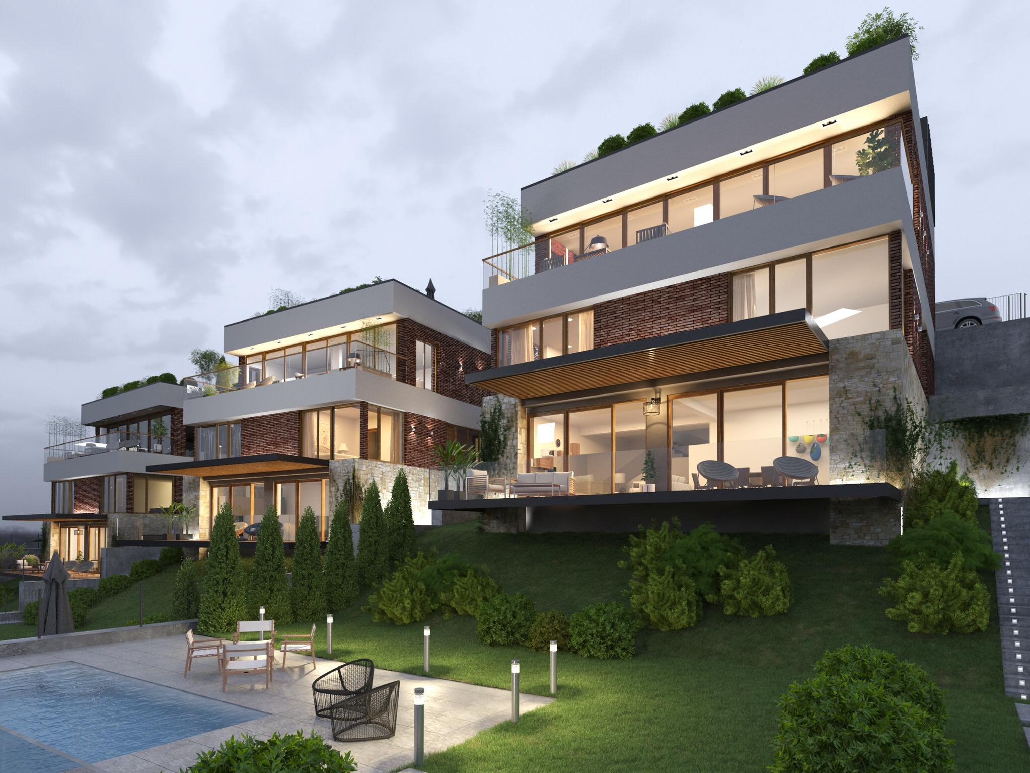 Localizare Ansamblul de locuințe „Vista Residence” se află amplasat la poalele pădurii și este complet asigurat cu aer curat și la maxim aprovizionat de liniște și confort. Locuințele noi sunt localizate pe strada Uliului din zona Grigorescu al orașului Cluj – Napoca. Lângă complexul locativ se află Grădinița „Țăndărică” și Centrul Educațional „Green School”. De la casele noi pietonal se ajunge doar prin 1,2 km până la Bazinul Olimpic „Grigorescu” și până la Clubul de Tenis „Transilvania”. Hipermarketul Cora se află la o distanță de doar 1,7 km pe jos și este de parcurs doar un kilometru până la supermarketul Profi. De asemenea, la o distanță de dor 1,5 km – 2 km față de complexul locativ funcționează sucursale bancare, este Oficiu Poștal, se află Policlinica Grigorescu și Parcul cu plajă Grigorescu. De la casele complexului locativ „Vista Residence” se parcurge o distanță de circa 6 – 7 km până în centrul orașului Cluj Napoca. Sunt de parcurs 5 km de la locuințe până la Gara Centrală și până la Aeroportul International din Cluj – Napoca „Avram Iancu” se ajunge parcurgând 13,5 km. Prezentarea complexului locativ și caracteristici tehnice Proiectul locativ „Vista Residence” este o mică societate imobiliară compusă din vile unice și foarte atractive. Casele locative sunt construite cu câte un Demisol plus un Parter plus un Etaj și plus o Terasă generoasă și locuințele sunt proiectate de tip – Duplex. Casele sunt construite calitativ din materiale durabile cu o structura de rezistență pe cadre din beton armat cu toți pereții exteriori perimetrali construiți din cărămidă termic și fonic eficientă, la fel ca și pereții și compartimentările interioare. Pe partea exterioară toți pereții sunt izolați termic cu un strat din vată bazaltică și toate fațadele caselor sunt finisate într-un stil arhitectural de clasică modernă și elegantă cu folosirea ideilor performate de design și cu aplicarea finisajelor exterioare moderne: cu cărămidă decorativă exterioară de culoare bej la parter și maro la etaj și parțial cu tencuială decorativă în nuanțe deschise și calde pe fonul căreia perfect se evidențiază ferestrele mari instalate, ce sunt din profil de culoare aurie și au geam termoizolant. Vilele dispun de multe spații verzi, au oferit mult spațiu exterior pentru piscină, pentru organizarea locurilor de joacă pentru copii, unde pot fi amenajate trotuare și alei interioare personale pentru fiecare unitate locativă. Ansamblul rezidențial „Vista Residence” are toate locurile de parcare organizate în curtea fiecărei case, unde pot fi instalate lifturi auto cu sisteme de tip Klaus. Despre cum se predau în exploatare unitățile locative Ansamblul de locuințe „Vista Residence” este format din șase proprietăți locative cu aspecte ultra moderne. Vilele sunt excepțional proiectate, sunt foarte primitoare și au scheme logice și funcționale și dispun de 4 camere spațioase. Suprafețele proprietăților rezidențiale variază între 148 mp și 172 mp și toate locuințele sunt foarte luminoase și au spații generos vitrate și dispun de înălțimea liberă a tavanelor de 330 cm. Toate locuințele sunt oferite în vânzare semifinisate și se predau în folosință beneficiarilor cu toți pereții nivelați, cu toate pardoselile turnate cu sapă și cu toate instalațiile inginerești montate. Toate instalațiile sanitare și termice sunt conduse cu țevi până la poziții și toate instalațiile electrice la fel sunt montate și sunt trase prin pereți. Vilele dispun de utilități și au apă, canal și curent electric. Din ferestrele locuințelor „Vista Residence” se deschid vederi panoramice asupra orașului, nu ezitați să le vizitați și să vă convingeți personal de toate facilitățile imobilelor. Pentru mai multe informații despre casele excepționale, despre materialele folosite la construcție, despre toate metodele de plată acceptate și pentru a vă programa cu o vizionare la locuințele noi, vă rugăm să treceți direct pe pagina web a complexului imobiliar „Vista Residence”, unde găsiți afișate și toate contactele directe către managerii de vânzare a Dezvoltatorului.